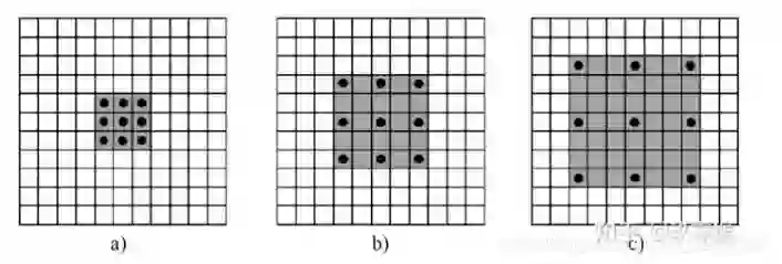a是普通的卷积过程(dilation rate = 1),卷积后的感受野为3