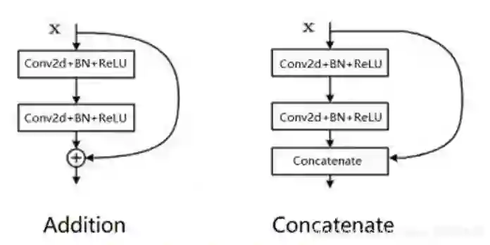 Addition和Concatenate分支操作统称为shortcut,Addition是在ResNet中提出,两个相同维度的feature map相同位置点的值直接相加,得到新的相同维度feature map,这个操作可以融合之前的特征,增加信息的表达,Concatenate操作是在Inception中首次使用,被DenseNet发扬光大,和addition不同的是,它只要求两个feature map的HW相同,通道数可以不同,然后两个feature map在通道上直接拼接,得到一个更大的feature map,它保留了一些原始的特征,增加了特征的数量,使得有效的信息流继续向后传递。