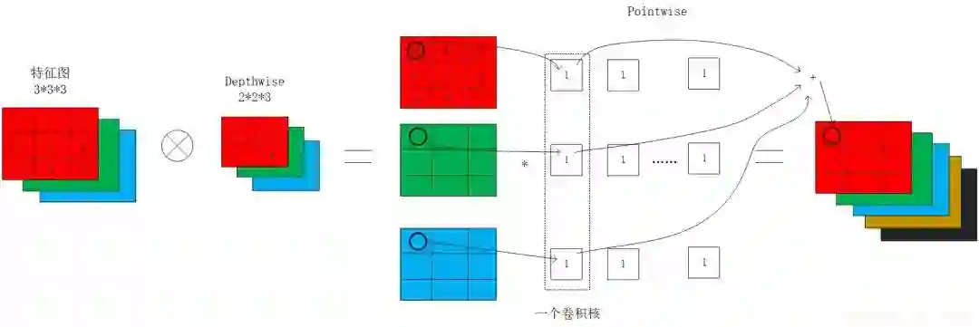 深度可分离卷积将传统的卷积分两步进行,分别是depthwise和pointwise。首先按照通道进行计算按位相乘的计算,深度可分离卷积中的卷积核都是单通道的,输出不能改变feature map的通道数,此时通道数不变;然后依然得到将第一步的结果,使用1*1的卷积核进行传统的卷积运算,此时通道数可以进行改变。