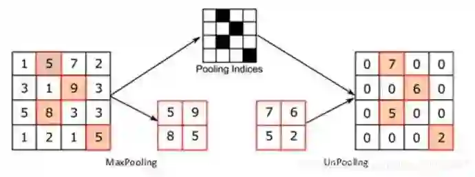 Max Unpooling,在对称的max pooling位置记录最大值的索引位置,然后在unpooling阶段时将对应的值放置到原先最大值位置,其余位置补0;