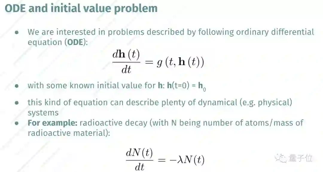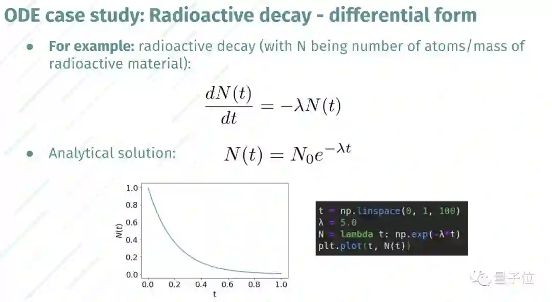 在PPT和Jupyter Notebook中,小哥先解释了什么是ODE。ODE通常被用来描述很多动力系统,比如放射性衰变问题。