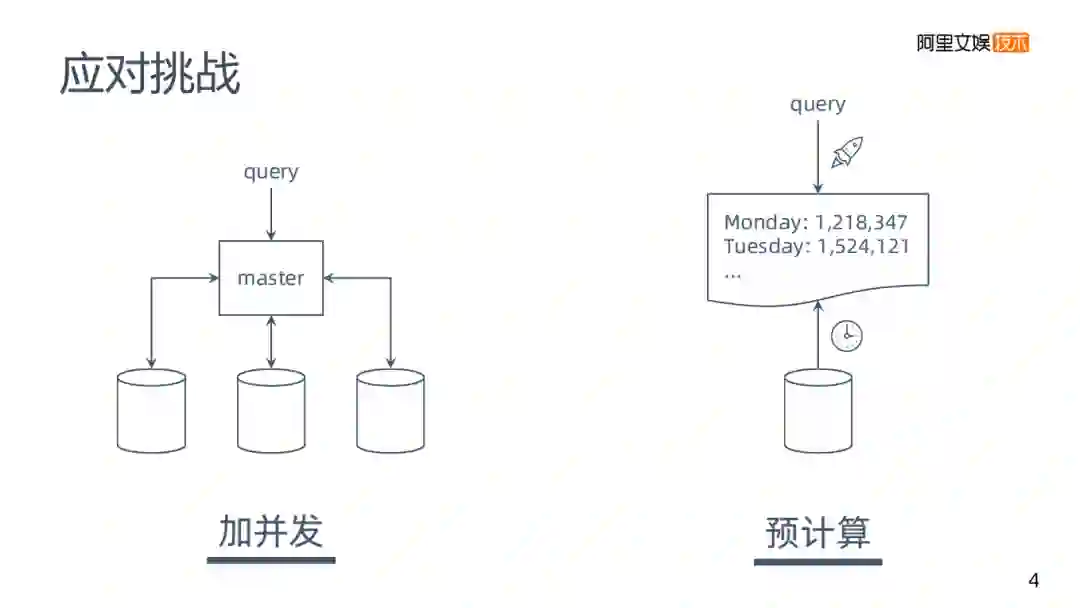 第三类场景是实时查询的一种场景,跟刚才的BI类又不相同,主要发生在优酷性能的统计数据里面,在这个场景下我们一般做预计算,但偏向实时的,分析比较复杂,通常适用于故障定位的场景。