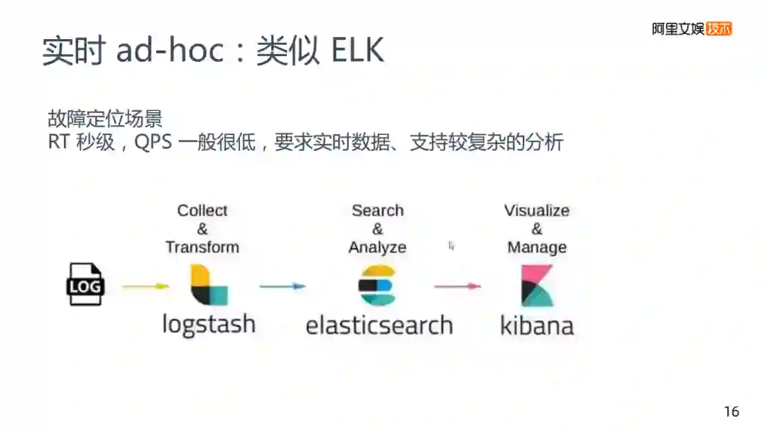 比如如何去定位查找错误,查找机房存在问题,这都是一些比较常见的场景。这个场景对RT的要求较好。RT和QPS方面没有API要求那么高,它的用户人数也不是那么多,没有一些高并发的场景,但是对数据的实时性和分析的复杂性还是存在要求的,这种的预计算也不大可能去满足,为解决这类问题,我们做的是一个类似ELK的方案。