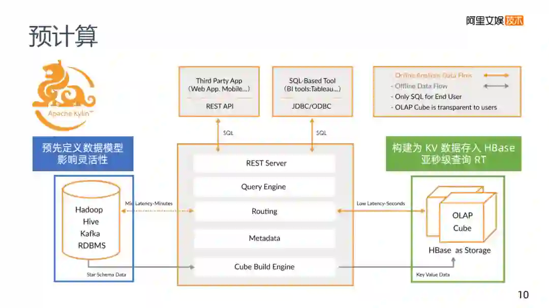 讲到预计算,就不得不提到Apache Kylin,它的架构如图,需要预先定义查询的内容。