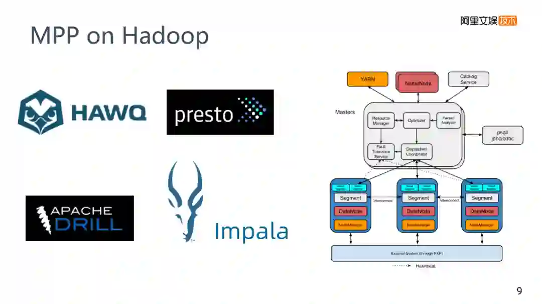相对于互补的话,MPP on Hadoop就不得不提一下,网易使用Impala,还有相关的presto这些名字,在这里就把他们归类为MPP on Hadoop技术。MPP技术它是GREENPLUM,它的各个节点是传统关系型数据库postgre。比如,刚才场景中是先批处理再MPP,如果想用GREENPLUM,需要将Hadoop中的数据导入到GREENPLUM中,因为它们底层的存储是不一样的,Hadoop底层是HDFS,而GREENLUM底层是postgre,它们的存储上是没有关系的,必须要有一个导入的过程,正常来说Hadoop的生态,Hive是一个常用的批处理技术,它的速度比较慢,为了加速计算,就诞生了MPP on Hadoop这样的技术。