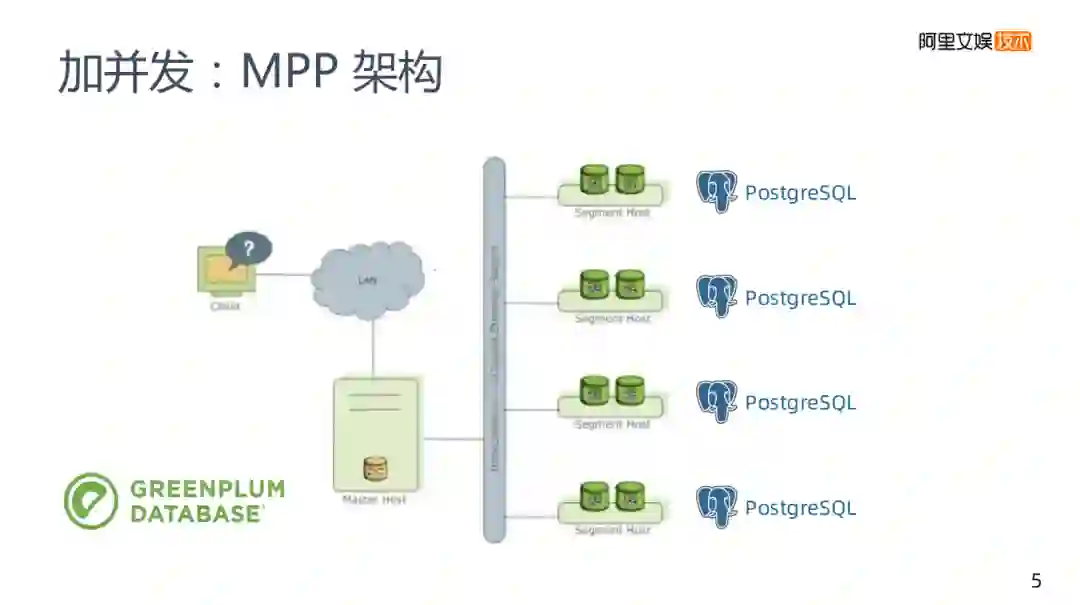 第一类的加并发方案,类似之前所说的添加多个mysql,GREENPLUM引擎也是基于一个传统的关系型数据库PostgreSQL,在GREENPLUM里面有多个PostgreSQL实例,每个实例都有Master节点去管理,再将接收到的请求拆分后分发到各实例,再将实例集中在一起返回,这就是一个MPP架构的基本原理。