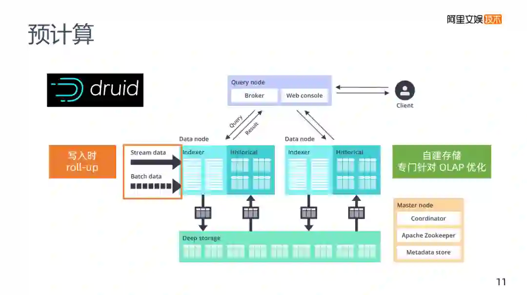 预计算还要介绍的是druid,将其归类为预计算并不是特别明确,它有预计算的能力,当数据写入时,它有一个roll-up这样的配置,在第一步数据写入时会帮助你进行一个数据减少的工作,在它本身内部的架构里,它不是Kylin需要HBase这样的存储,druid内部有一个自己的存储,专门针对OLAP进行了优化。druid还是一个时序的存储,在时序上做优化,让老的数据存在老的存储里,新的数据存在新的存储里。在预计算和查询的灵活性方面,如果说只能够选择一套方案的话,可以考虑只使用druid。