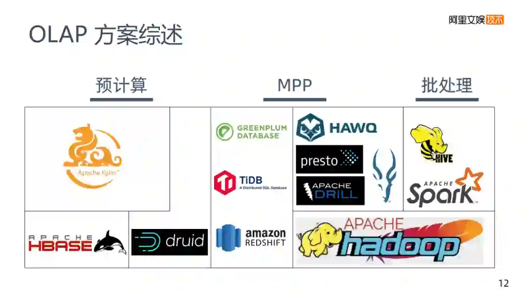 再往右就是druid,它本身有预计算的能力是自建存储的。比如说美团做了一个Kylin on druid这样的工作,计算仍然是Kylin,但是它把底层的HBase换成druid,这样做的考虑将druid和HBase比较,实际在查询的能力方面还是要强不少的。