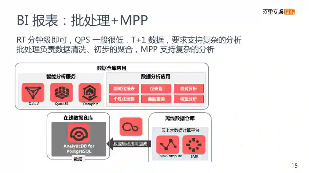 通过对业务的理解,将关键的数据保留,通过批处理预先建好DWS层的模式处理,在这基础之上,往MPP的表中导入从而支持这个复杂的分析,底层的架构是一个离线的批处理的计算,批处理完成之后将数据放入离线的表中,并导入到阿里的数仓,使用MPP的数仓来支持,以及BI类工具来支持我们的业务需求,满足复杂分析的要求。