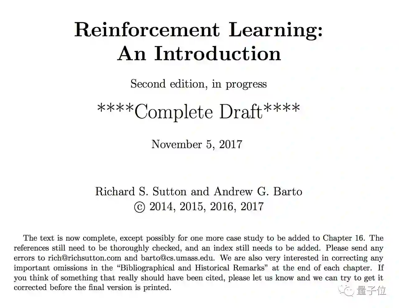 萨顿:第二版的完整草稿目前已经可以在richsutton.com上看到。Andy Barto和我正在定稿:验证所有的参考文献,诸如此类。印刷版将于明年初发行。