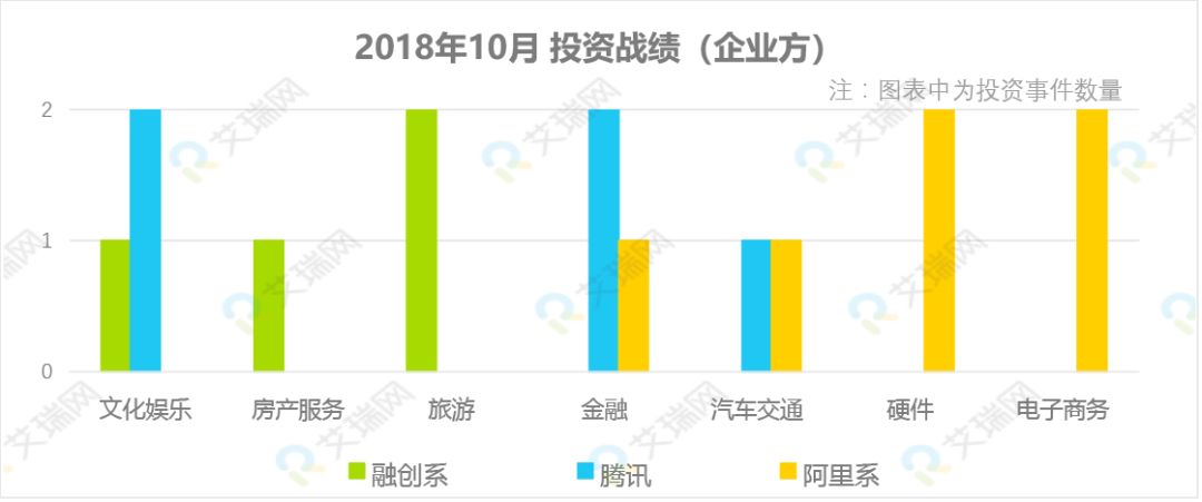 2018年10月投资盘点企业方投资行业事件数前三名分别为阿里系(阿里巴巴及菜鸟网络、蚂蚁金服等相关企业)腾讯及融创系(融创中国&信达融创)。