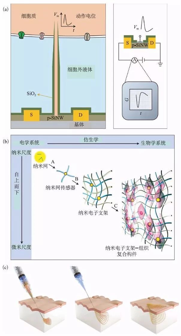 (a) 基于SiNW 的器件用于细胞内跨膜电位检测[2];(b) 三维纳米尺度柔性电子器件培养细胞和组织[3];(c) 可装载在注射器中的网状电子器件注射进入脑组织中[4]