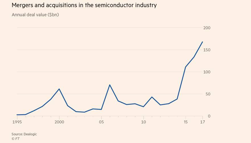 《经济学人》认为,半导体行业的合并只会加快,在存储芯片和微处理器两个领域都是如此。芯片制造商力图在一个正快速成熟的行业内快速扩张:2006至2016年间,合并交易总额达5560亿美元。然而先前芯片业快速增长的源泉,比如PC、平板电脑、及智能手机的普及,已经枯竭。尽管2016年芯片的全球销售额达到3440亿美元,但在过去五年里的销售增长已经趋于停滞。