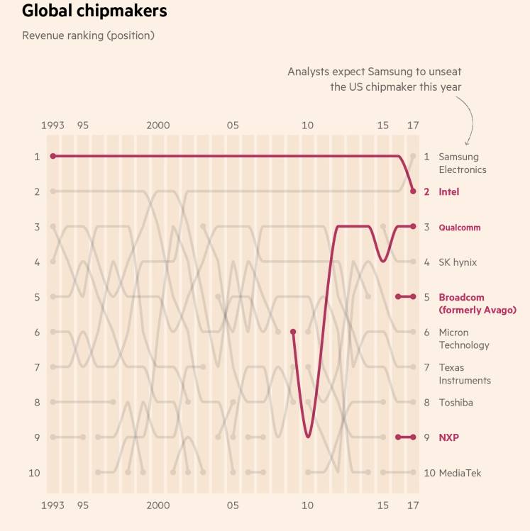 这笔意向收购的双方——高通和博通——都处于芯片领域的食物链顶端。这条食物链异常复杂,不同种类的芯片制造商在其中相互捕杀。在博通试图收购之前,2016年10月底,高通宣布将以380亿美元(包括债务在内,企业价值470亿美元)吞并荷兰芯片公司恩智浦(NXP)。而恩智浦曾于2015年完成了与另外一家大芯片公司飞思卡尔(Freescale)的合并。