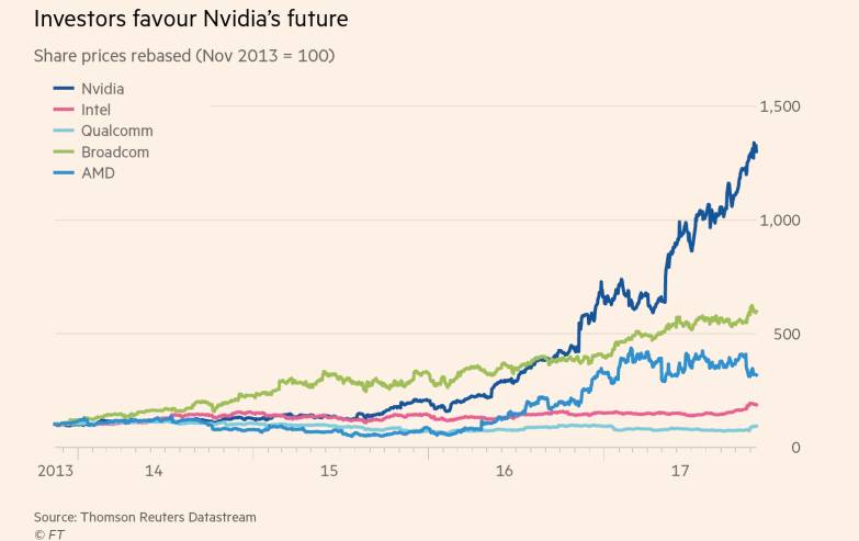 在自动驾驶汽车和人工智能领域,英特尔和英伟达正在彼此追赶。英伟达的图形处理器已经被深度学习的研究人员热切地采用。去年,英伟达是标准普尔500指数表现最好的股票,上涨了224%。其股价今年再次翻番。