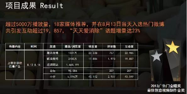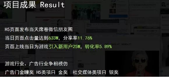 《天天爱消除》视频广告推出后,取得了非常好的传播效果,得益于创意本身的有趣,引发了用户的自主传播、最后得到社会群体的广泛关注,并在行业里面获得非常多的奖项,成为团队最早期的具有代表性的经典案例。