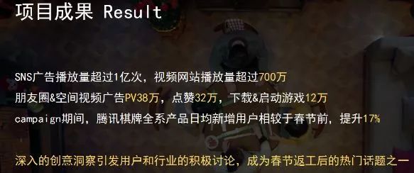通过品牌视频整合文案,这支广告想告诉用户:时光荏苒,时光和距离的变化会冲淡很多人的情感,但很多情感是围绕在桌边的,腾讯棋牌会让情感成为延续的可能。借助朋友圈推广,这个创意也获得了很好的效果,成为春节返工潮的热门话题。