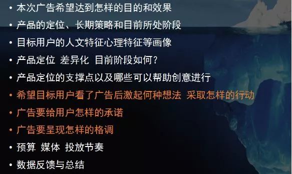 回到营销创新模块,广告创意并不像是常规理解的发散感性的创作过程,而是一个系统的工作。在营销创意企划开始的时候,创意团队都会提出一系列问题:本次广告希望达到怎样的目的和效果?产品的定位、长期策略和目前所处阶段是怎样?产品背后目标用户的人文心理特征画像是怎样?和同质化产品相比,我们的产品有哪些核心差异化卖点,目前做的怎么样?产品定位的支撑点以及哪些可以帮助创意沟通和连接?同时,创意团队在以下三方面也会重点关注:希望目标用户看了广告后采取怎样的行动?广告要给用户怎样的承诺?广告呈现怎样的格调?比如是幽默搞笑逗趣的还是严肃感人温情的?之后,我们还会关注有多少时间、多少预算、广告投放计划、节奏和渠道有哪些?在广告落地以后,还会做数据分析,总结佐证广告内容的有效性。