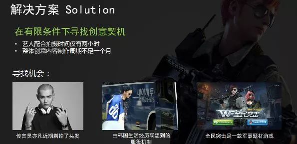 这个案例带给创意团队的主要挑战是怎样在拮据的条件下寻找创意契机,以及如何用移动端特质做一个有趣的广告内容展现。创意团队根据当时艺人剪头发和早期韩国生活经历,联想到服役,结合《全民突击》游戏的军事题材特征,一系列事件经过大胆设想,提出核心创意洞察点“如果看到新闻上说我家凡凡要入伍,会不会吓死宝宝”,在此基础上打造了创意广告,并成为当时现象级爆款移动互联网广告。
