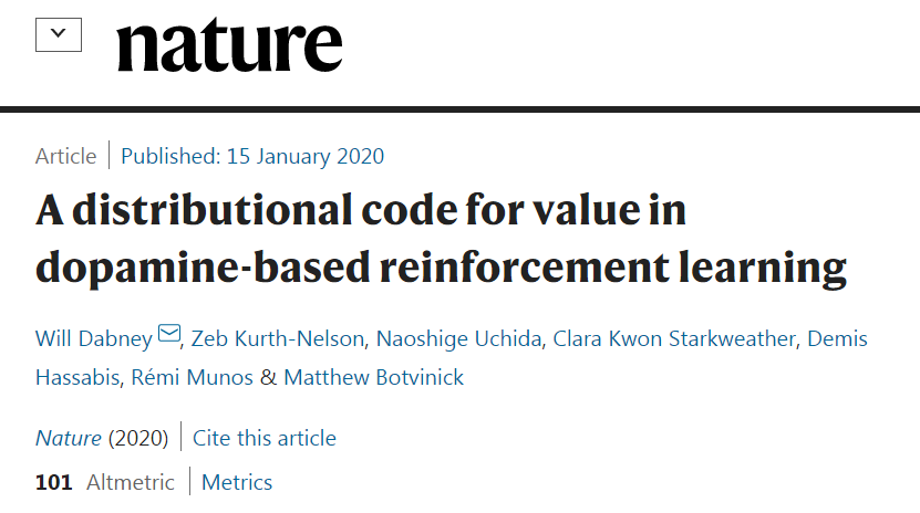 分布式强化学习是智能体在围棋、星际争霸等游戏中用到的技术,但 DeepMind 的一项研究表明,这种学习方式也为大脑中的奖励机制提供了一种新的解释,即大脑也应用了这种算法。这一发现验证了分布式强化学习的潜力,同时也使得 DeepMind 的研究人员越发坚信,「现在的 AI 研究正走在正确的道路上」。