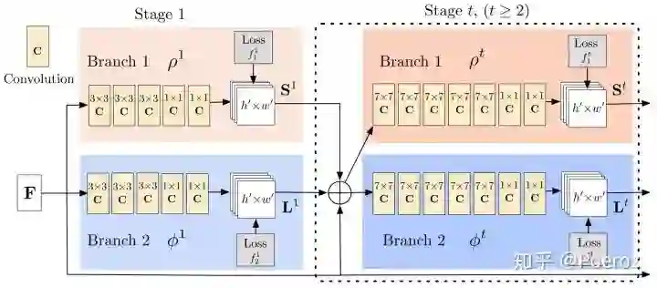 个limb对应的PAF,每个pixel对应一个二维向量,表示该pixel所在limb的方向。二者都是pixel-wise的。这里借鉴CPM使用了多个stage不断进行refinement,后一阶段的输入是前一阶段的