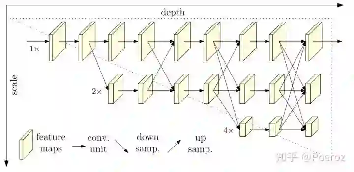 此外非常重要的一点,从图中我们也可以看到,为了使不同分辨率之间的信息融合在一起,从而获得包含多个分辨率下信息的feature map,在相邻的stage之间(每添加一个新的低分辨率分支时视为一个新stage的开始)加了fusion结构,fusion直观上类似在两边的feature maps之间加了一个fc层,下采样通过多个 卷积,上采样就是简单的nearest neighbor upsampling。这里的融合就是简单的累加。通过多次fusion,最后得到的feature map包含的信息是非常丰富的,也因此HRNet达到了很好的效果。