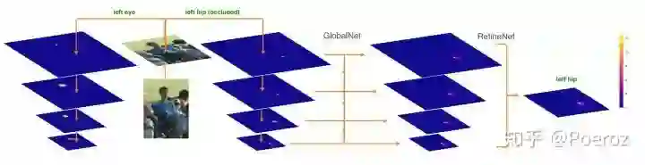 下面这张图给出了一个例子(绿点表示ground truth),对于eye来说较容易定位,通过GlobalNet即可定位到。而对于hip来说,在原图中被遮挡,仅仅使用GlobalNet难以直接精确定位。通过RefineNet将语境信息整合进来,才使得这些关键点被定位。
