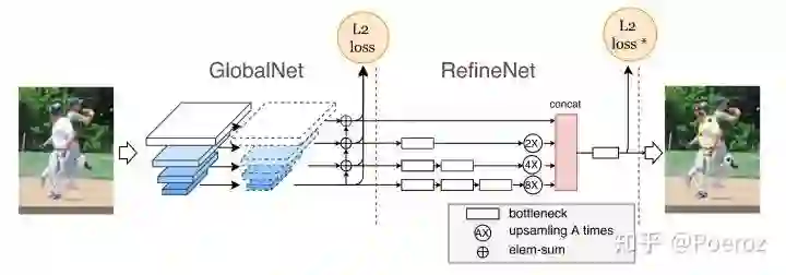 CPN,Cascaded Pyramid Network,是2017年旷视提出的一种网络结构,获得了COCO 2017 Keypoint Benchmark的冠军,网络结构如下图所示。这个网络可以分为两部分:GlobalNet和RefineNet,从名字也可以看出后半部分网络是在前半部分的基础上做refinement。GlobalNet的作用主要是对关键点进行一个初步的检测,由于使用了强大的ResNet作为backbone,网络能够提取到较为丰富的特征(在此之前的CPM、Hourglass都没有使用,因此网络的特征提取能力较差),并且使用了FPN结构加强了特征提取,在这个过程中像head、eyes这些简单且可见的关键点基本能够被有效地定位。而对于GlobalNet没有检测到的关键点,使用RefineNet进行进一步的挖掘,RefineNet实际上是将pyramid结构中不同分辨率下的特征进行了一个整合,这样一些被遮挡的、难以定位的关键点,根据融合后的上下文语境信息能够更好的被定位到。