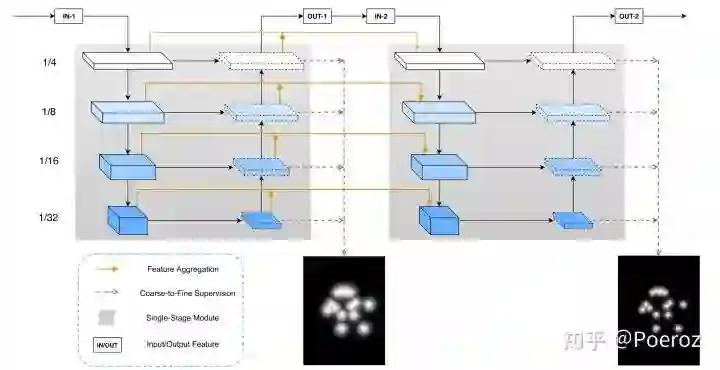 首先,对于每个stage的module,MSPN采用了前面提到的CPN中的GlobalNet(backbone为ResNet),当然这里使用其他backbone也没问题。其次,MSPN增加了跨阶段的特征融合,即图中的黄色箭头。由于经过反复的下采样-上采样,会有不可避免的信息损失,故MSPN中将前一个stage下采样和上采样过程中对应分辨率的两个feature maps都连接过来,与当前stage下采样的feature map进行融合,这样当前stage得到的feature map就包含了更多prior information,减少了stage之间的信息丢失。此外,这种类似残差结构的设计也有助于缓解梯度消失问题。最后,MSPN还采用了coarse-to-fine supervision,我们知道姿态估计的ground truth是以关键点为中心的二维高斯分布,这里的高斯核大小是一个超参数。直观上来说,对于multi-stage网络,随着stage的增加,我们对keypoint的估计是一个coarse-to-fine的过程,这样我们进行intermediate supervision的时候,可以将ground truth也设置成coarse-to-fine的heatmap,也就是前面stage的高斯核较大,后面stage的高斯核较小,随着stage的增加要求关键点位置越来越精确。