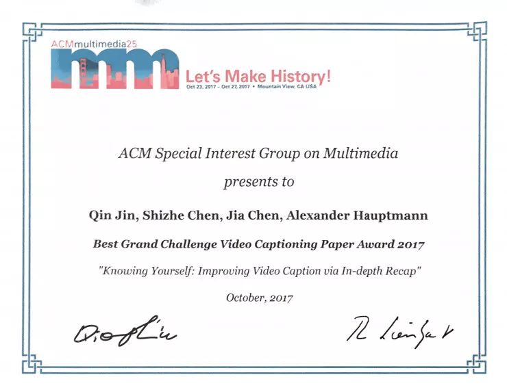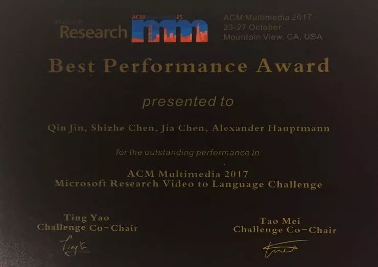 金琴(以下用A代表):谢谢!感谢ACM Multimedia和MSR组织这样的公共挑战赛,为促进Video to Language的研究提供了很好的数据和评测平台。很开心我们蝉联该项Grand Challenge的冠军,一份耕耘一份收获,这是对我们团队扎实做研究的奖励。我希望大家继续保持对研究的激情和严谨,持续做出更好的研究发现。