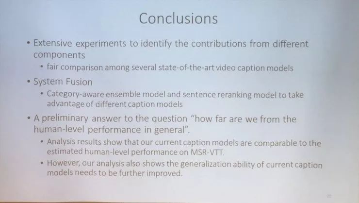 A:在msrvtt数据集上我们试着回答了一下这个问题。我们用人工的描述ground truth估计了人类的caption平均性能。在caption任务的几个客观评价指标上,我们的系统和人类平均水平基本持平,有些指标上高于人类,有些指标上与人类相差不多。但这并不意味着我们攻克这个任务了。一方面,现有的评价指标还不能很好衡量句子的质量,说一句general但没有太多信息量的话评测会高,另一个重要方面就是模型的泛化性能和人的差距较大。因此,下一步会针对提高caption模型的泛化能力、表达能力(生成更细节更生动的描述)等方面进行研究突破。