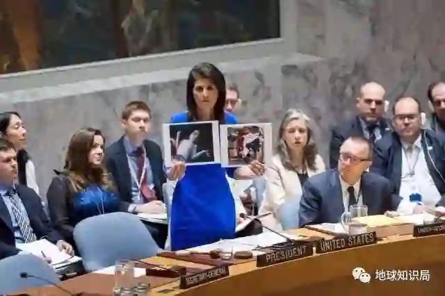 2017年,美国驻联合国代表黑莉展示叙利亚疑似“化武袭击”受害者照片