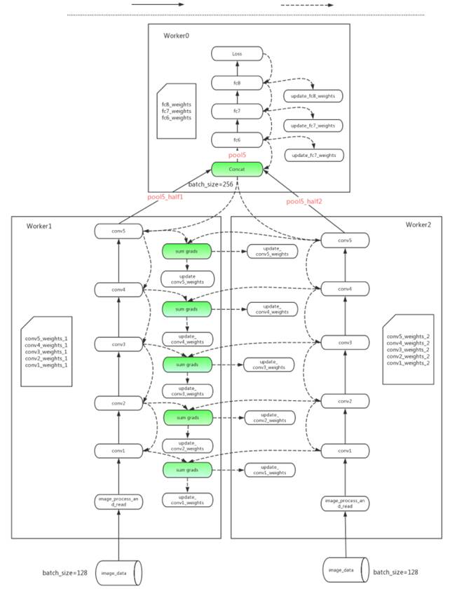 在 Hybrid-parallelism 中,针对不同模型网络的特点,引入数据并行与模型并行的混合策略,针对计算占比高的部分应用数据并行,针对模型通信量大的部分应用模型并行,在多机计算加速与减少通信开销之间获得了较好的平衡点。下图看出将这个优化策略应用在 TensorFlow 里 AlexNet 模型的具体体现。