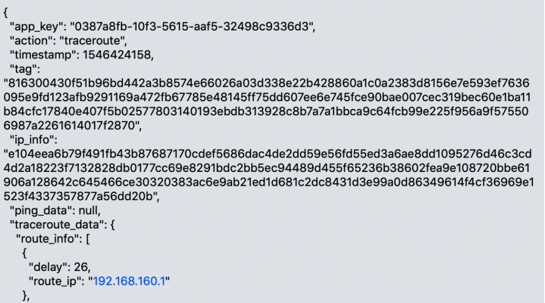 为解决获取终端有效的外网 IP,我们在探测网络质量的同时,向后台发送一个 HTTP 请求,从请求头中剥离出外网 IP,并查询归属地、运营商等信息。网络探测数据搜集后,非对称加密上报到后台与相应的外网 IP 匹配,完成验证存储。