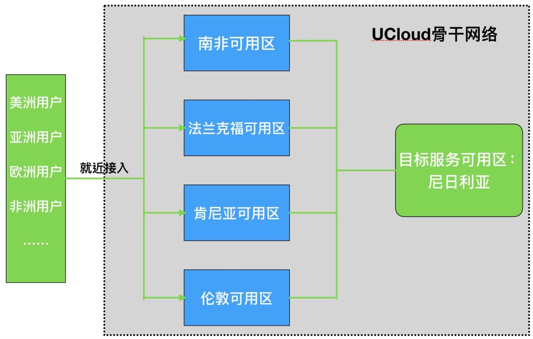 2018 年 9 月 25 日,UCloud 拉各斯数据中心落地。第一步解锁尼日利亚后,非洲业务板块愈加清晰:西非以尼日利亚、加纳为主;东非以肯尼亚、坦桑尼亚、埃塞俄比亚为主;北非埃及、摩洛哥;南非。但是,我们的用户目标覆盖非洲全大陆,现实瓶颈却是跨国互联访问体验差,甚至有的邻国访问绕行欧洲伦敦或阿姆斯特丹。