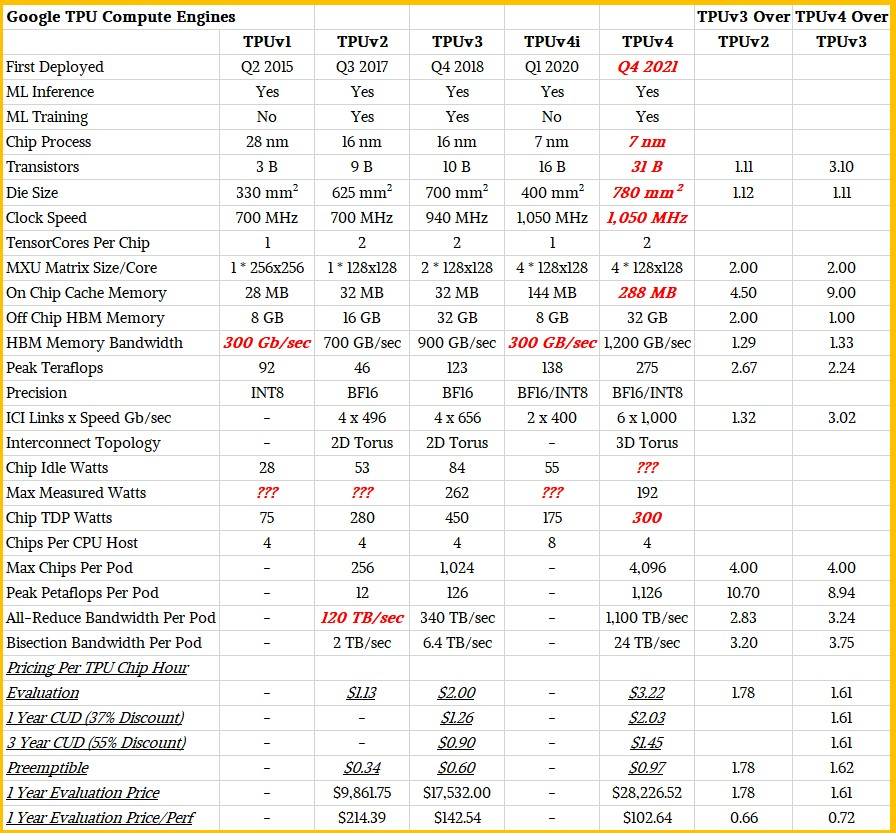 并且作者预测TPUv5i和TPUv5计算引擎将会采用5纳米进程,几乎可以肯定的是,这些引擎即将开始测试了,如果Google生产了 TPUv4i和TPUv4,以及 Google Cloud上的客户能够普遍使用 TPUv4的话。