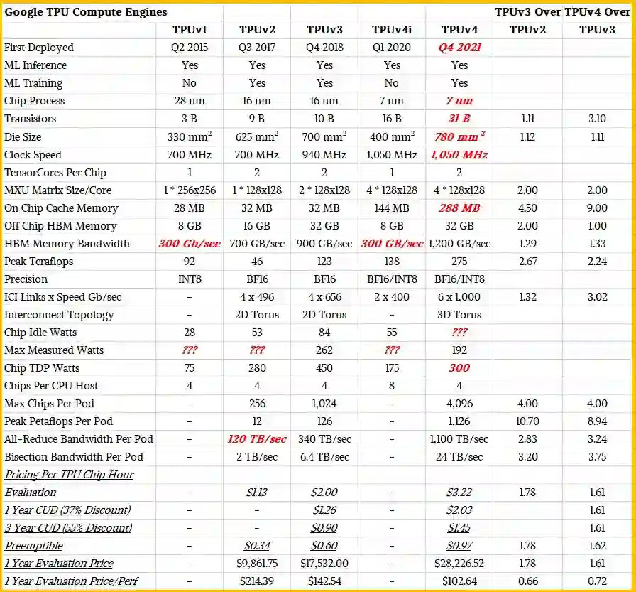 TPUv4i 推理晶片采用台积电公司的七纳米工艺制造,一年半前投产,作者猜测通用的TPUv4也是采用同样的七纳米工艺。