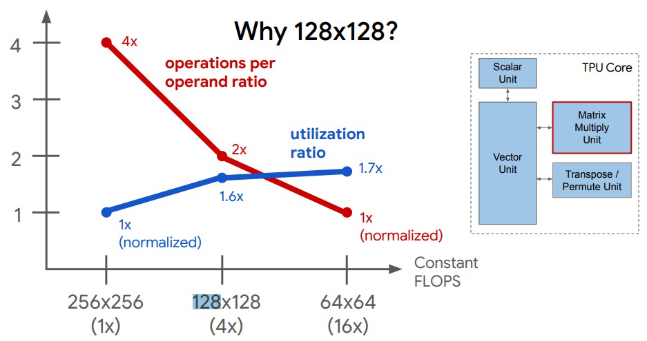矩阵吞吐量和利用率之间的最佳点是128 × 128数组,至少对于 Google 自己的代码来说是这样的。