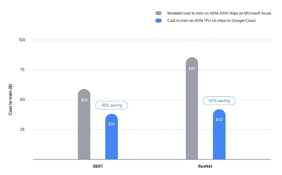 归根结底,比硬件供应和速度更重要的是人工智能训练的成本,使用4096个TPUv4 pod和一个同样堆叠规模的Nvidia A100 GPU对比。