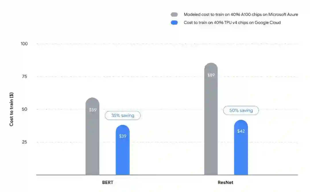 在价格上,TPUv4芯片上花费一个小时的价格比在TPUv3芯片上花费的价格高出61% ,但是它提供的性能是TPUv3芯片的2.23倍,也就是说性价比提高了28%