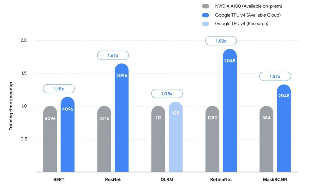Vahdat 说,平均而言,TPUv4在 MLPerf 测试中的表现比 Nvidia A100s 高出40% ,有趣的是,Google 在这五个测试中提交的 MLPerf 2.0结果比使用 MLPerf 1.0套测试的 TPUv4高出50%