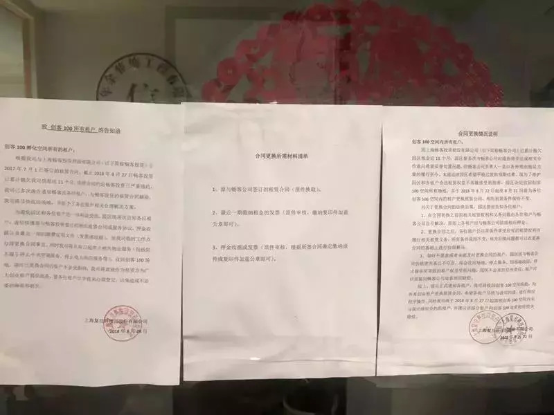 原房东上海复旦科技园已决定解除租赁关系,收回100创客,并从8月22日起向所有租户提供更换合同的相应业务。