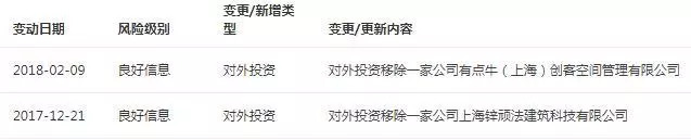 畅客投资最近一次的工商变更是2018年2月9日,已移除对有点牛(上海)创客空间管理有限公司的投资。