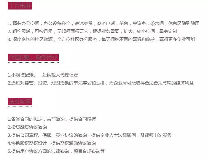 100创客官网信息显示,其提供的服务包括注册服务、培训服务、项目咨询管理服务、代理记账、税务代办和法务咨询等。