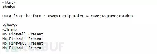 可以看到payload被打印在了HTML文档中,这也说明应用程序代码中没有任何的过滤机制,并且由于没有防火墙的保护,我们的恶意请求也未被阻止。