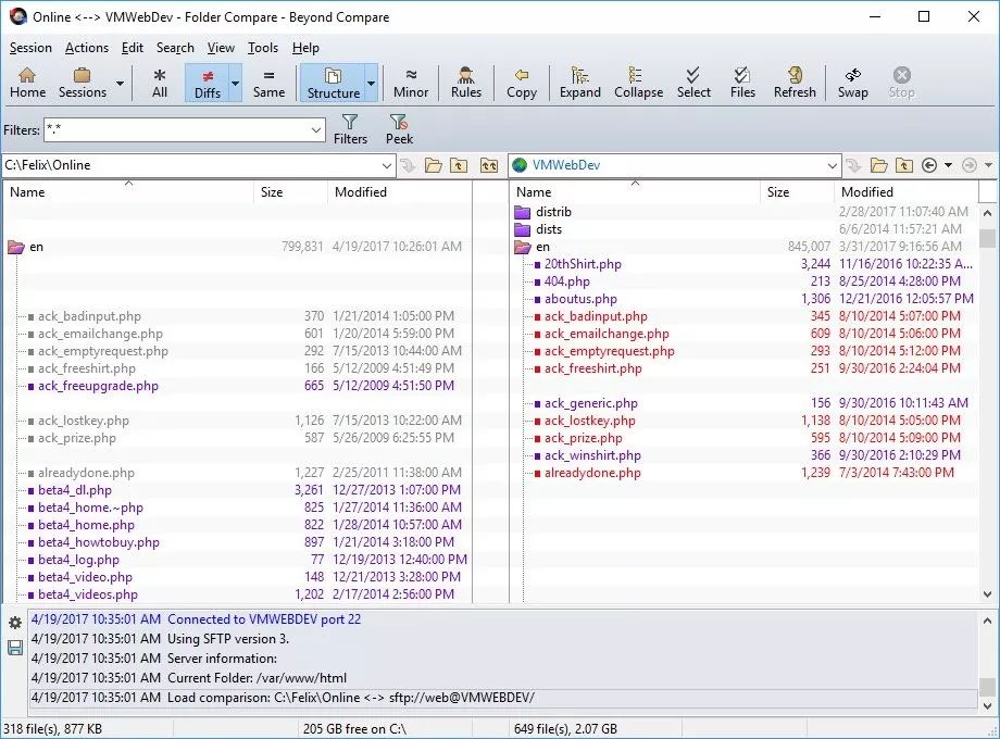 你可以选择两个文件,也可以选择两个文件夹,然后它就可以显示出不同的差异,可以将不同的内容选择合并保留,还可以直接忽略一边。