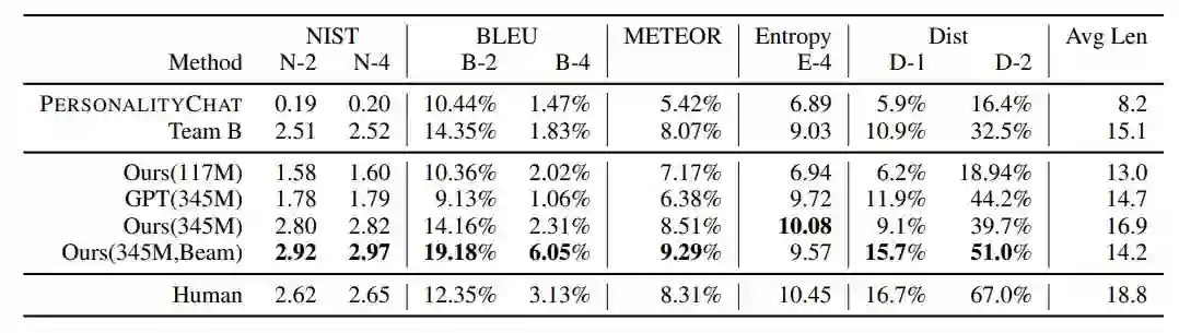 作者将 DialoGPT 与另外两个基准进行了比较:作者自己内部的基于 (Li et al., 2016a) 的序列到序列模型 PersonalityChat,这个模型是基于 Twitter 数据训练的,已经在微软 Azure 的 Cognitive Service 得到了实际应用。表 2 总结了自动化评估的结果。有 345M 个参数的 DialoGPT 以及波束搜索在几乎所有基准上都得到了最高的自动评估分数。