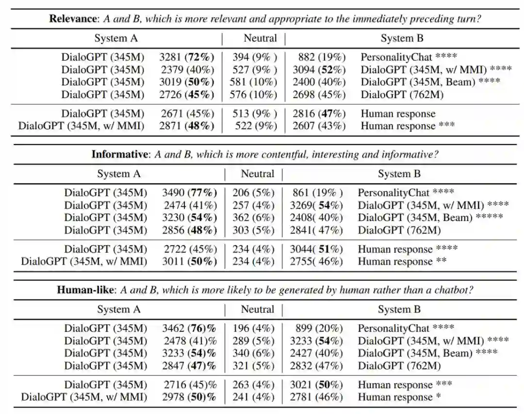 表 7 还表明「单纯」的 DialoGPT 基质模型可能就已经能达到与人类响应相近的质量了。