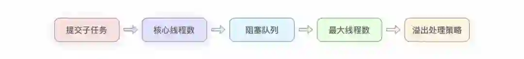 // 核心线程数int corePoolSize = 5;// 最大线程数int maximumPoolSize = 10;// 闲置线程保活时长int keepAliveTime = 1;// 保活时长单位TimeUnit keepAliveTimeUnit = TimeUnit.MINUTES;// 阻塞队列BlockingDeque<Runnable> workQueue = new LinkedBlockingDeque<>(50);// 线程工厂ThreadFactory threadFactory = new ThreadFactory() { public Thread newThread(Runnable r) { return new Thread(r); }};// 任务溢出的处理策略RejectedExecutionHandler rejectedExecutionHandler = new ThreadPoolExecutor.AbortPolicy();