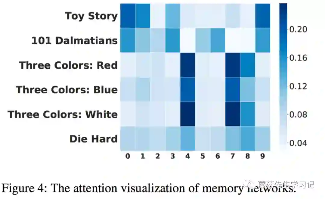 记忆单元的可视化: 验证每个记忆单元是否可以表示某种特定的兴趣。作者在MovieLens上做了case study。作者随机选了某个用户以及他观看过的电影,用其观看的电影直接作为query embedding,去计算在memory network上的注意力分数,即 。期望观察到的效果是,给定不同的电影query embedding,注意力分数分布不一样,在类似的电影上,某些维度的注意力分数也应该类似。